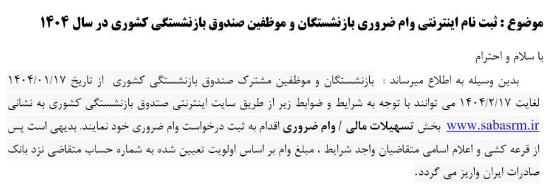 ثبت نام اینترنتی وام ضروری بازنشستگان و موظفین صندوق بازنشستگی کشوری ۲۰ فروردین ۱۴۰۴ | ۱۱:۵۹ کد : ۵۰۶۴۱ اطلاعیه ارسال به دیگران نام شما ایمیل شما ایمیل دریافتکننده ارسال انصراف تعداد بازدید:۴۴۰۴ ثبت نام اینترنتی وام ضروری بازنشستگان و موظفین صندوق بازنشستگی کشوری