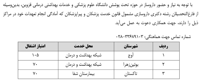 جذب نیروی داروساز مشمول قانون خدمت ۲۵ آذر ۱۴۰۴ | ۰۹:۰۰ کد : ۵۷۰۵۷ اطلاعیه ارسال به دیگران نام شما ایمیل شما ایمیل دریافتکننده ارسال انصراف تعداد بازدید:۲۶۲۱ جذب نیروی داروساز مشمول قانون خدمت در دانشگاه علوم پزشکی قزوین